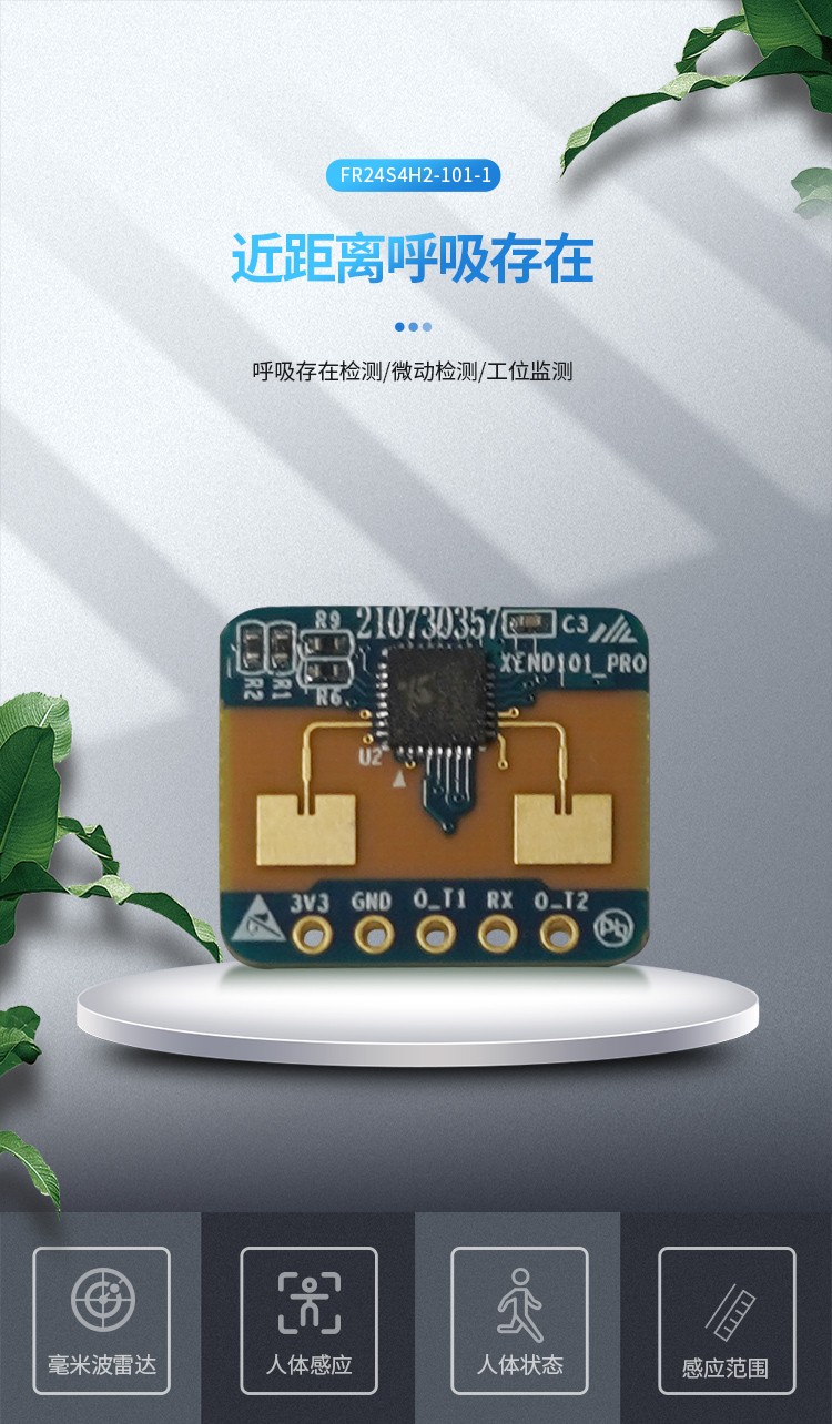 FR24S4H2-101-1 是飛睿智能設(shè)計的人體感應(yīng)傳感器,包含極簡化 24G 雷達傳感器硬件和智能算法固件。硬件搭載高性能 24GHz 一發(fā)一收天線和外圍電路;人體感應(yīng)算法,采用毫米波雷達距離測量技術(shù)和高性能芯片先進的專有信號處理技術(shù),實現(xiàn)對運動、微動和站立人體的精確感知。固件主要應(yīng)用在室內(nèi)場景,感知區(qū)域內(nèi)是否有運動或者微動的人體,實時刷新檢測結(jié)果。對運動人體的最遠感應(yīng)距離為 20 米,可輕松配置感應(yīng)距離范圍、不同區(qū)間的感應(yīng)靈敏度及刷新時間,支持 GPIO 和 UART 接口,即插即用,靈活應(yīng)用于不同的智能場景和終端產(chǎn)品。