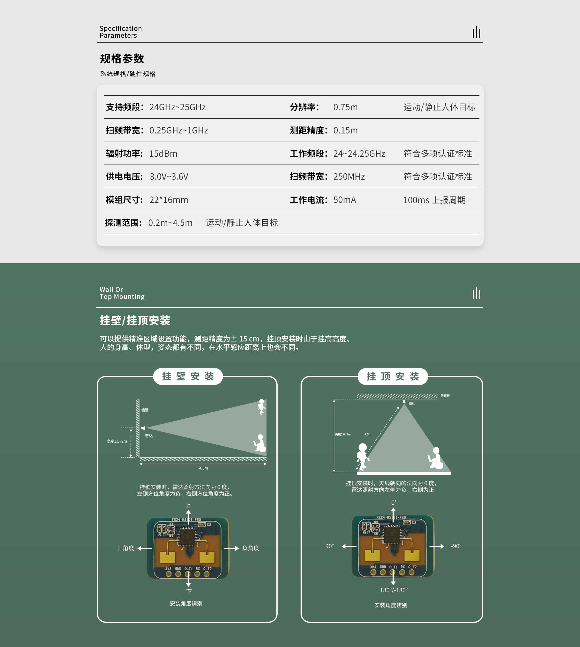 FR24S4H2-101P-1-H1 是飛睿智能設計的人體感應傳感器,包含極簡化 24G 雷達傳感器硬件和智能算法固件。FR24S4H2-101P-1-H1 硬件搭載高性能 24GHz 一發(fā)一收天線和外圍電路;采用毫米波雷達距離測量技術和高性能芯片先進的專有信號處理技術。