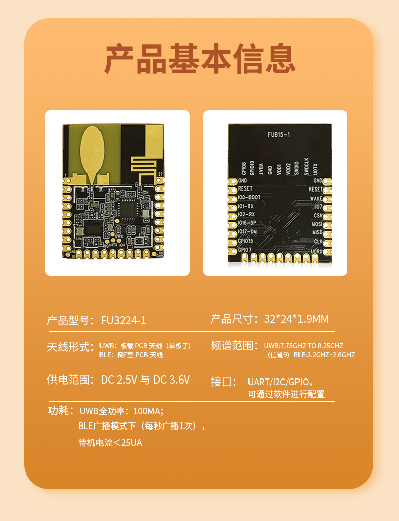 FU3224-1 UWB-BLE 模組是基于 UWB 芯片與 BLE5.3 芯片設計的一款智能綜合性模組,搭載 1 單元 PCB 高性能單極子 UWB 天線,1 單元倒 F 藍牙天線。